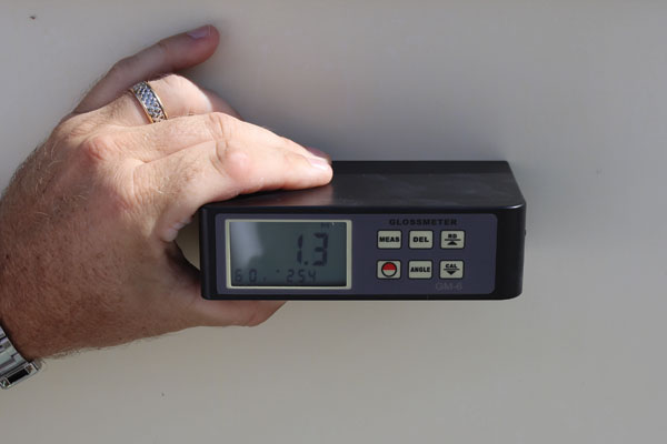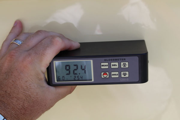 To measure the degree of luster remaining in the gel coat a Gloss Meter was used. This meter reflects light off the surface and captures the result. The gloss readings showed that there was almost no shine to the boat at all, with most readings registering in the single digits.