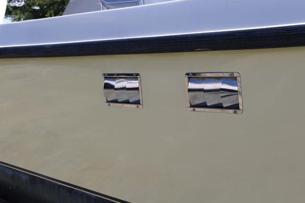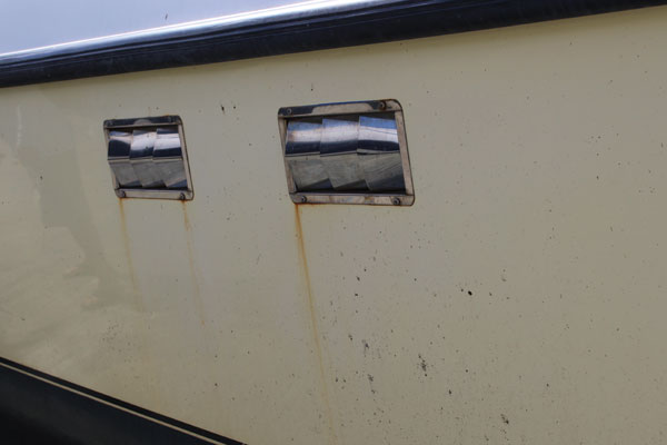 In addition, there was rust and other staining on both sides of the hull and top side. The stainless steel engine room vents had rust stains going down both sides of the hull. The hull also had scaling and hard water spots towards the bow.