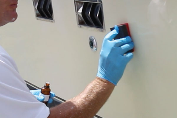 At this point we used Glidecoat’s Surface Wipe to wipe off all the areas to be coated. This step removes any further contaminants from the gel coat and ensures we are working with a clean surface. With the surface now fully prepared and consistent we started the application of Glidecoat’s Top Coating.
