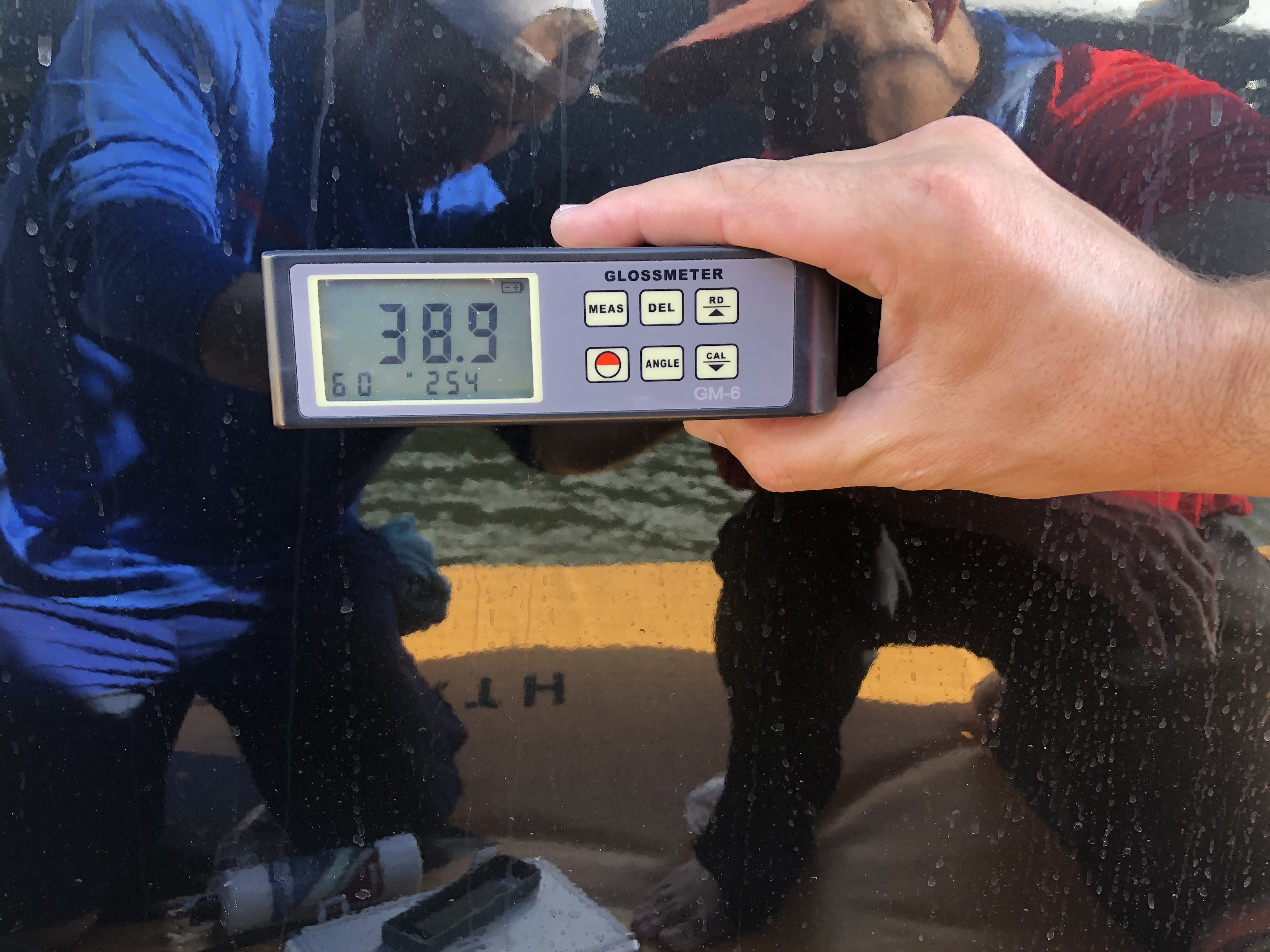 For Tony’s boat, the gloss meter readings were inconsistent and ranged from 38.9 on the hull to 75.9 on the transom.